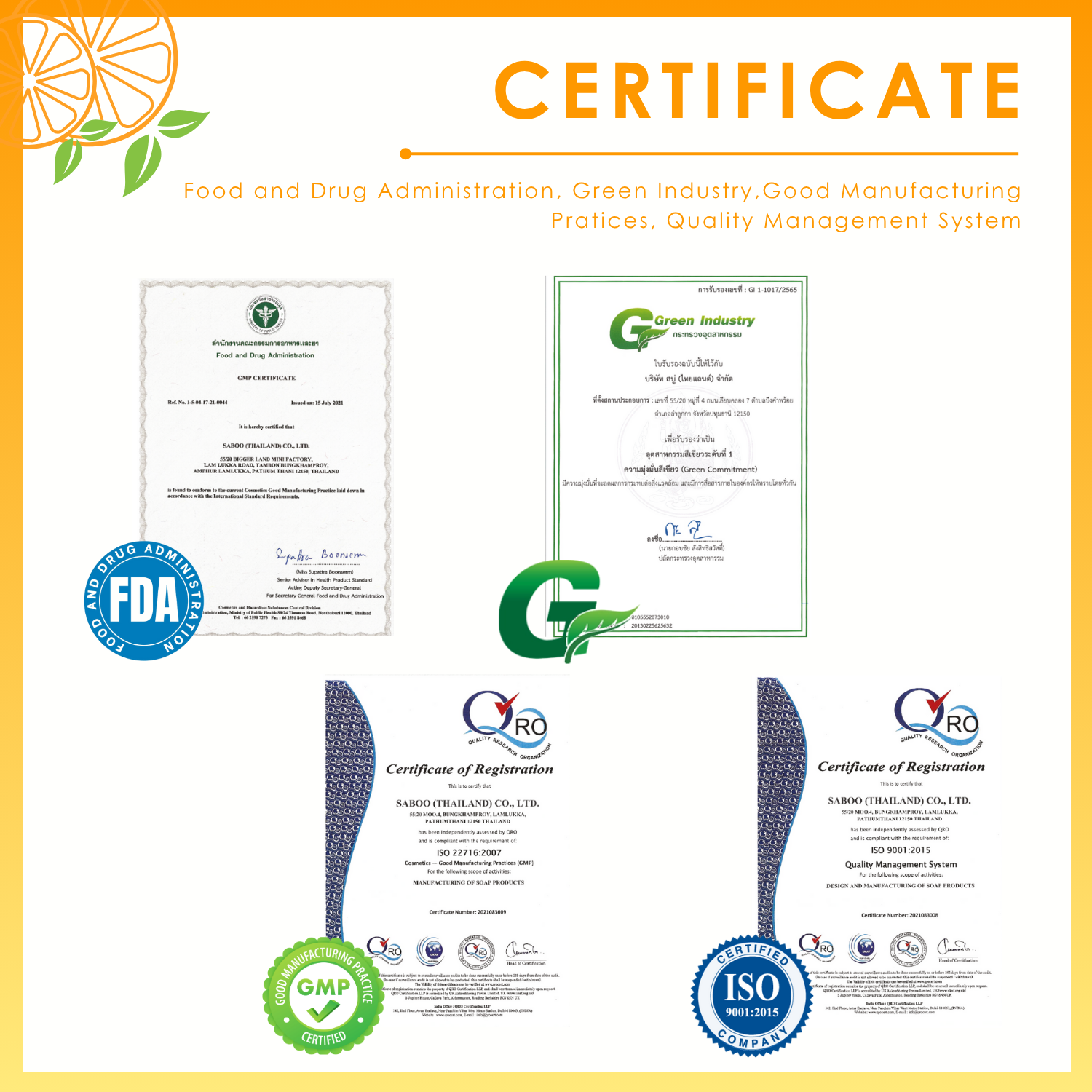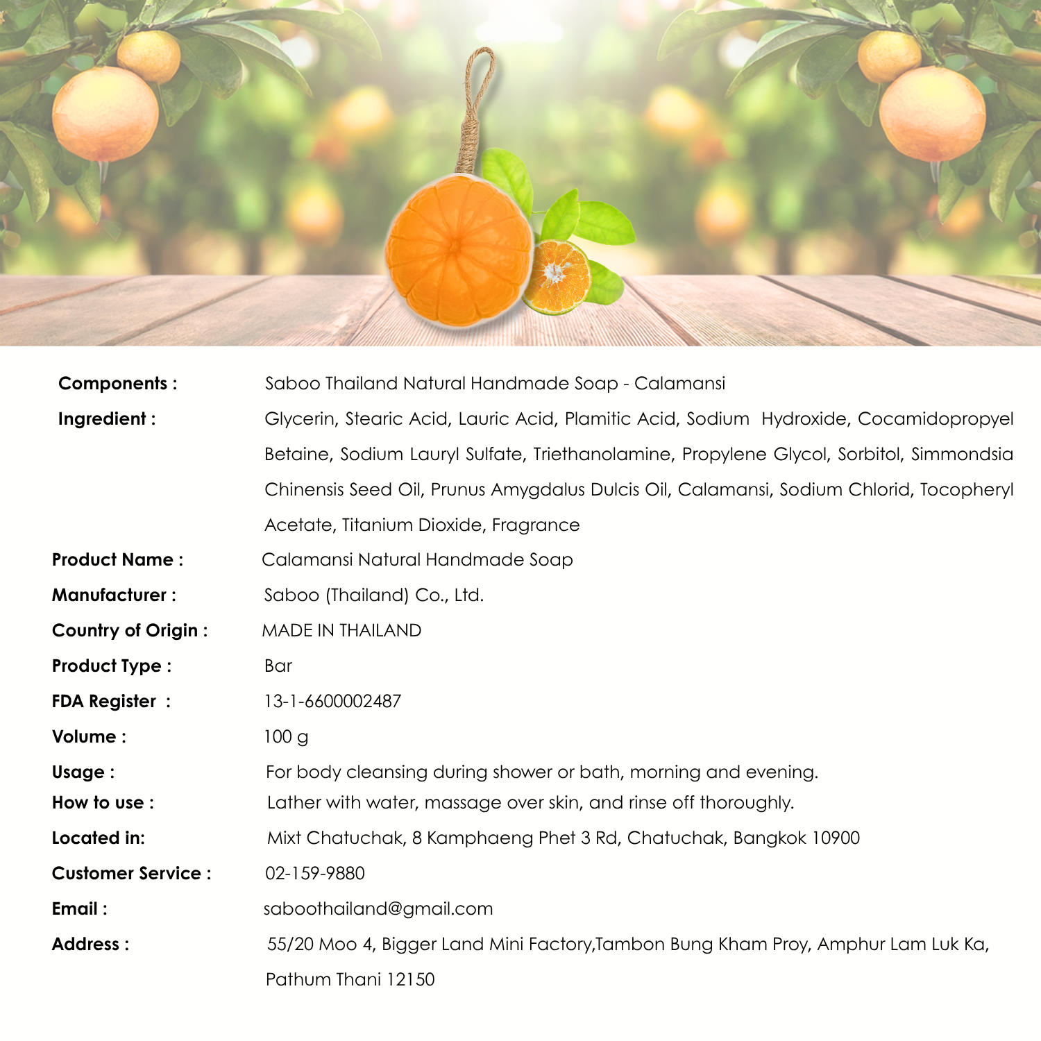 Factory Address: 55/20 Bigger Land Mini Factory, Lam Luk Ka Rd., Tambon Bung Kham Proy, Amphur Lam Luk Ka, Pathum Thani 12150