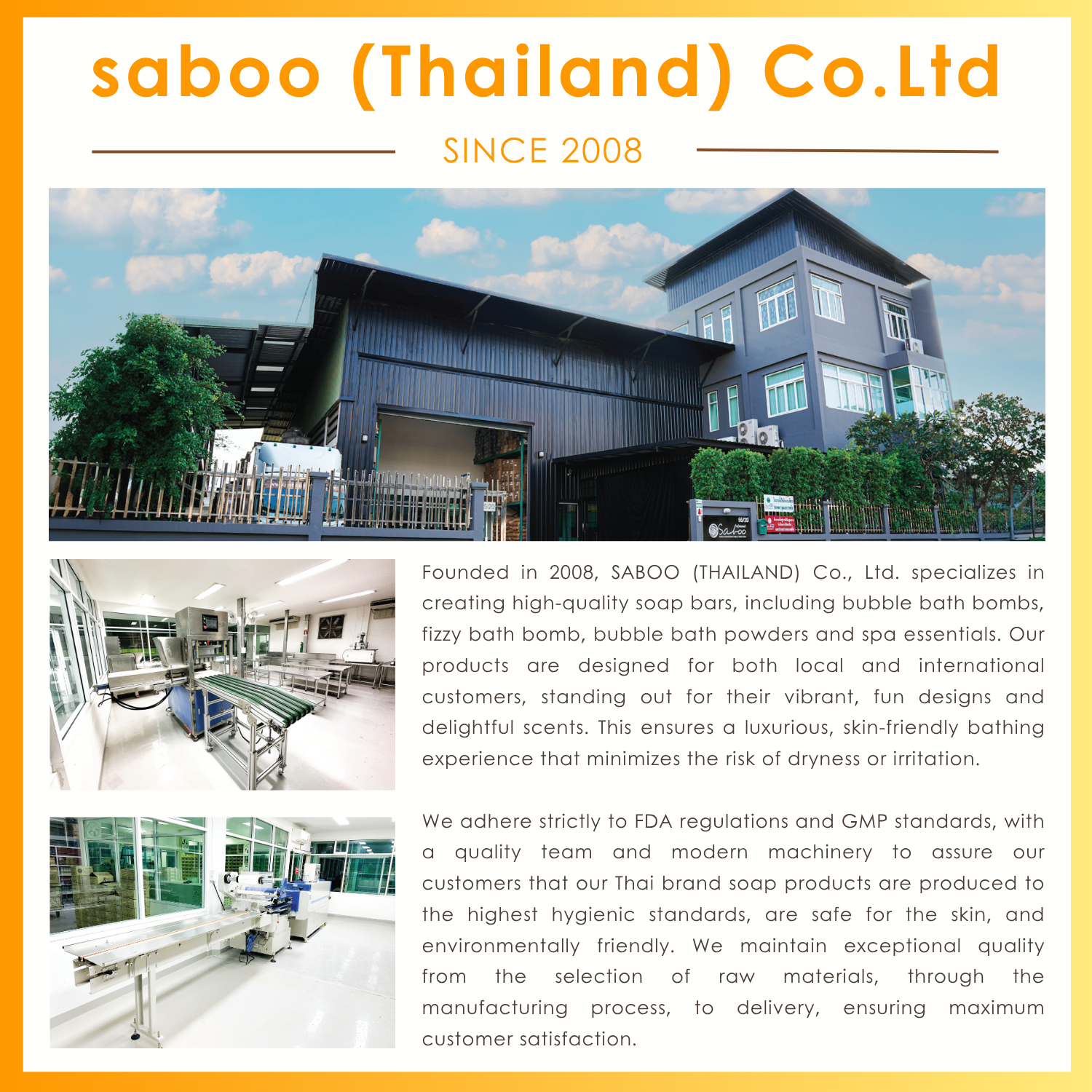 We adhere strictly to FDA regulations and GMP standards, ensuring our Thai brand products are produced to the highest hygienic standards, safe for skin, and environmentally friendly.