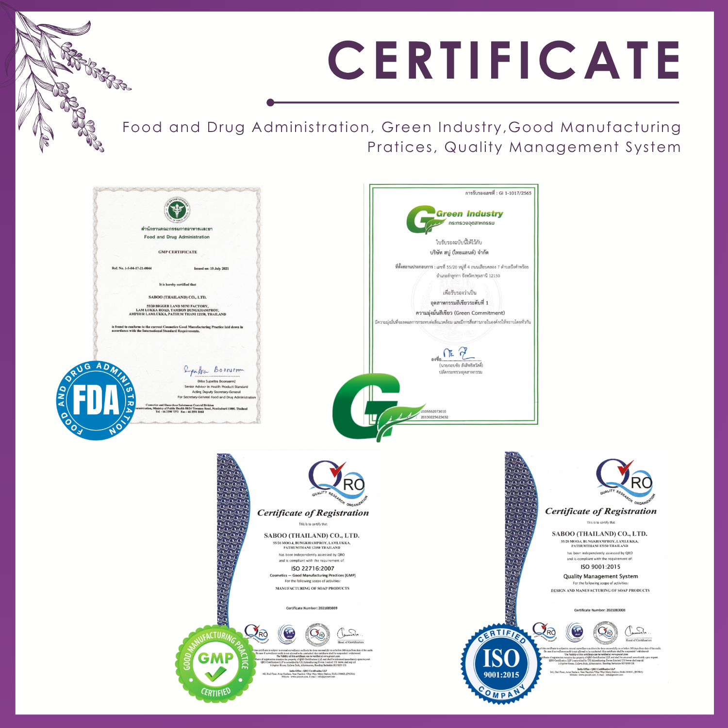 Factory Address: 55/20 Bigger Land Mini Factory, Lam Luk Ka Rd., Tambon Bung Kham Proy, Amphur Lam Luk Ka, Pathum Thani 12150