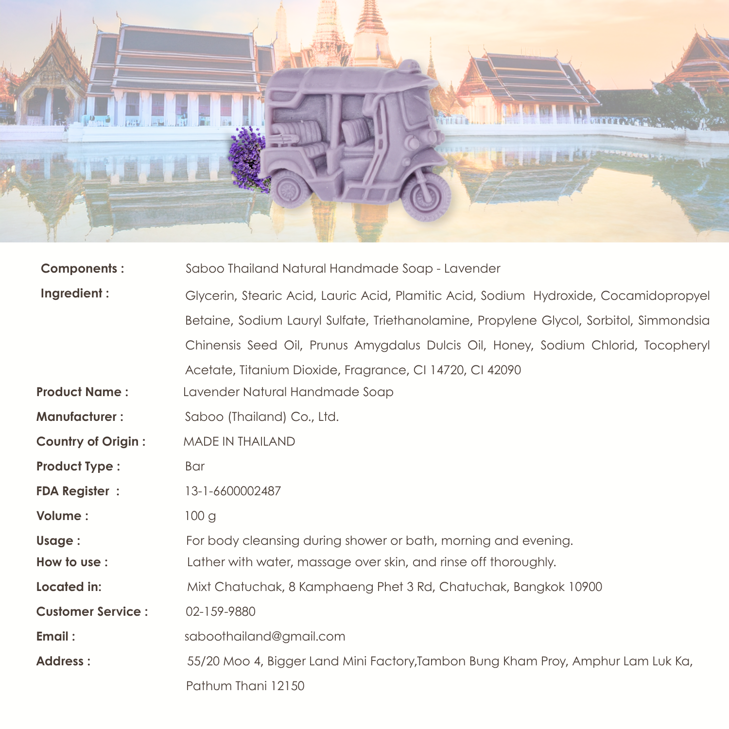 Relaxing tuk tuk lavender scent that brings the essence of Thai lavender fields to your bathing routine, leaving a peaceful, soothing fragrance that celebrates natural serenity.