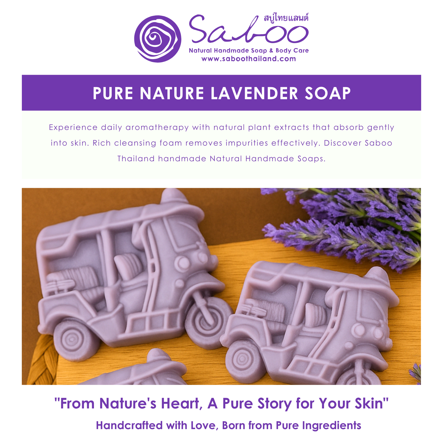 Our passion for natural skincare drives us to create handcrafted soaps using the finest ingredients, bringing you the peaceful tranquility of Thai tuk tuk lavender essence in every soothing bar.
