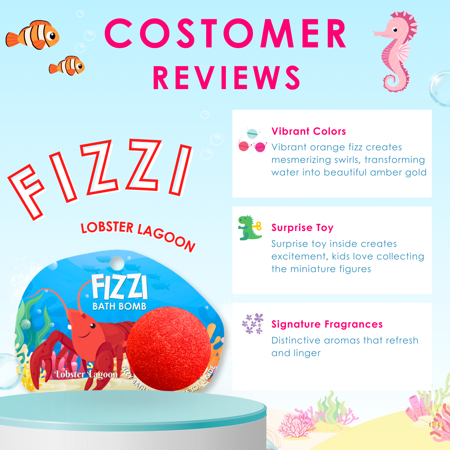 "Dive into a vibrant coastal adventure with luxurious scarlet-red fizz and invigorating ocean spice fragrance that transforms your bath into a lively lobster lagoon of energy and bold marine excitement."