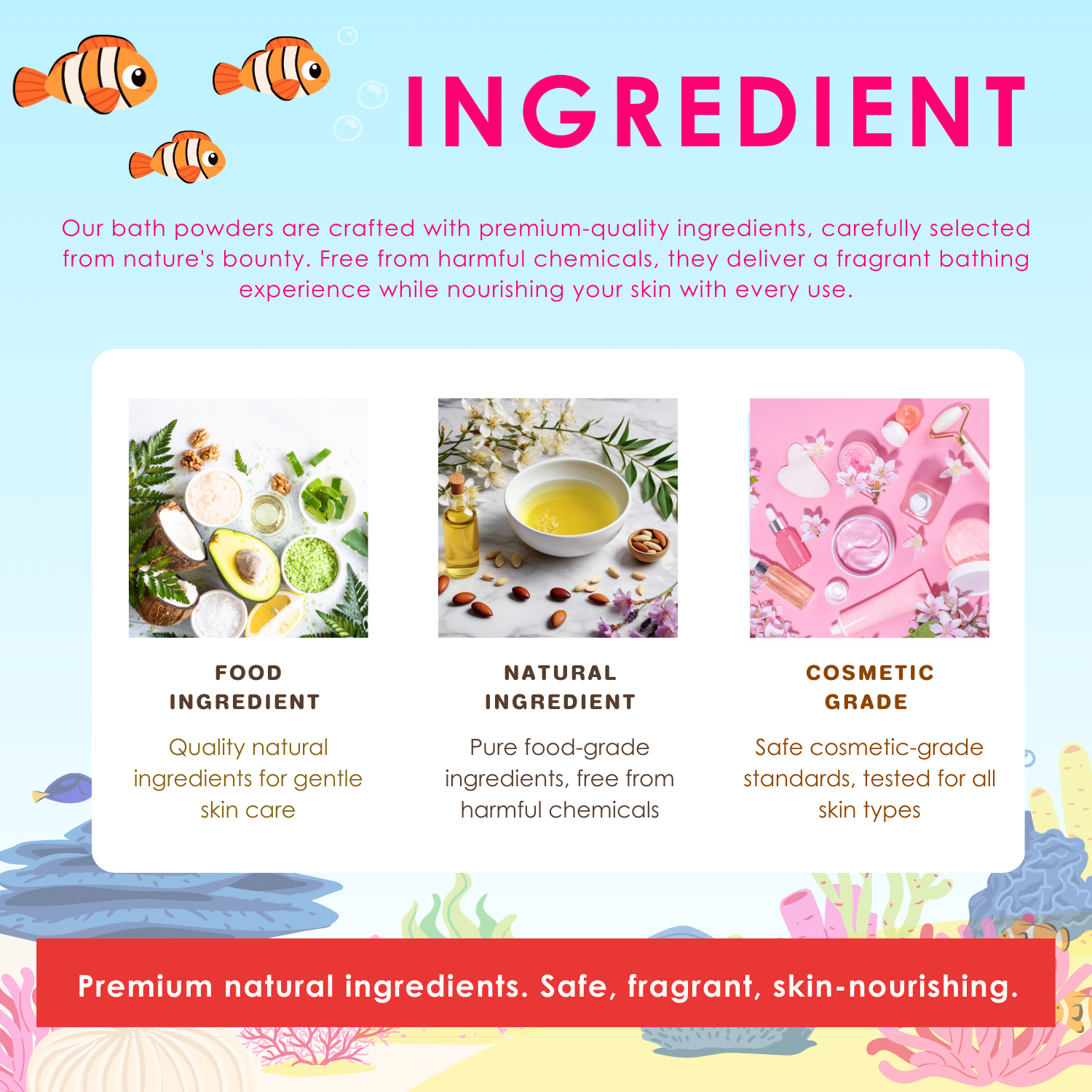 Key Ingredients Sodium Bicarbonate, Citric Acid, Cornstarch, Red Algae Extract, Coastal Seaweed, Spice Oil, Natural Ocean Fragrance, Coconut Oil, CI 16255 (Red)