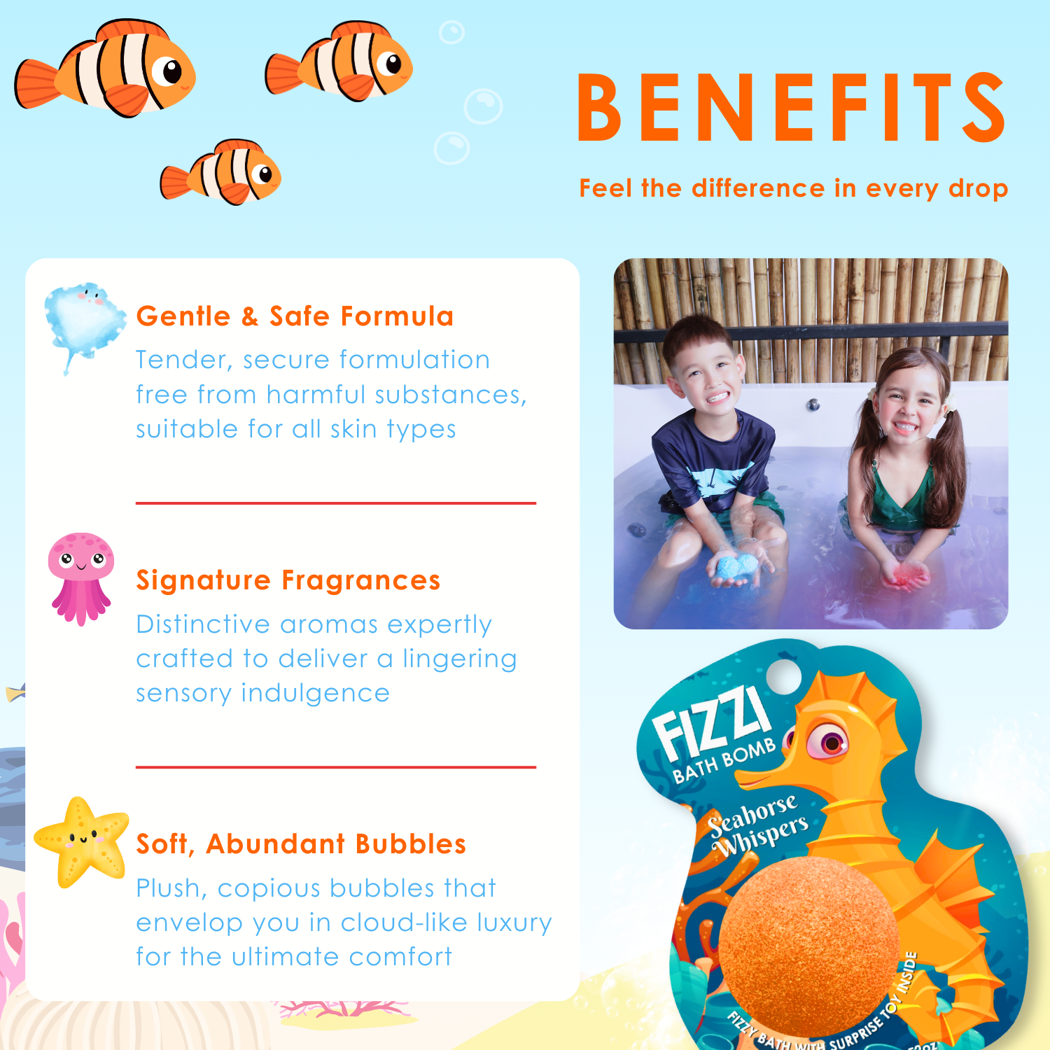 "Drift into a mystical coral garden adventure with luxurious amber-orange fizz and enchanting ocean spice fragrance that transforms your bath into a magical underwater realm of whispers and gentle currents."