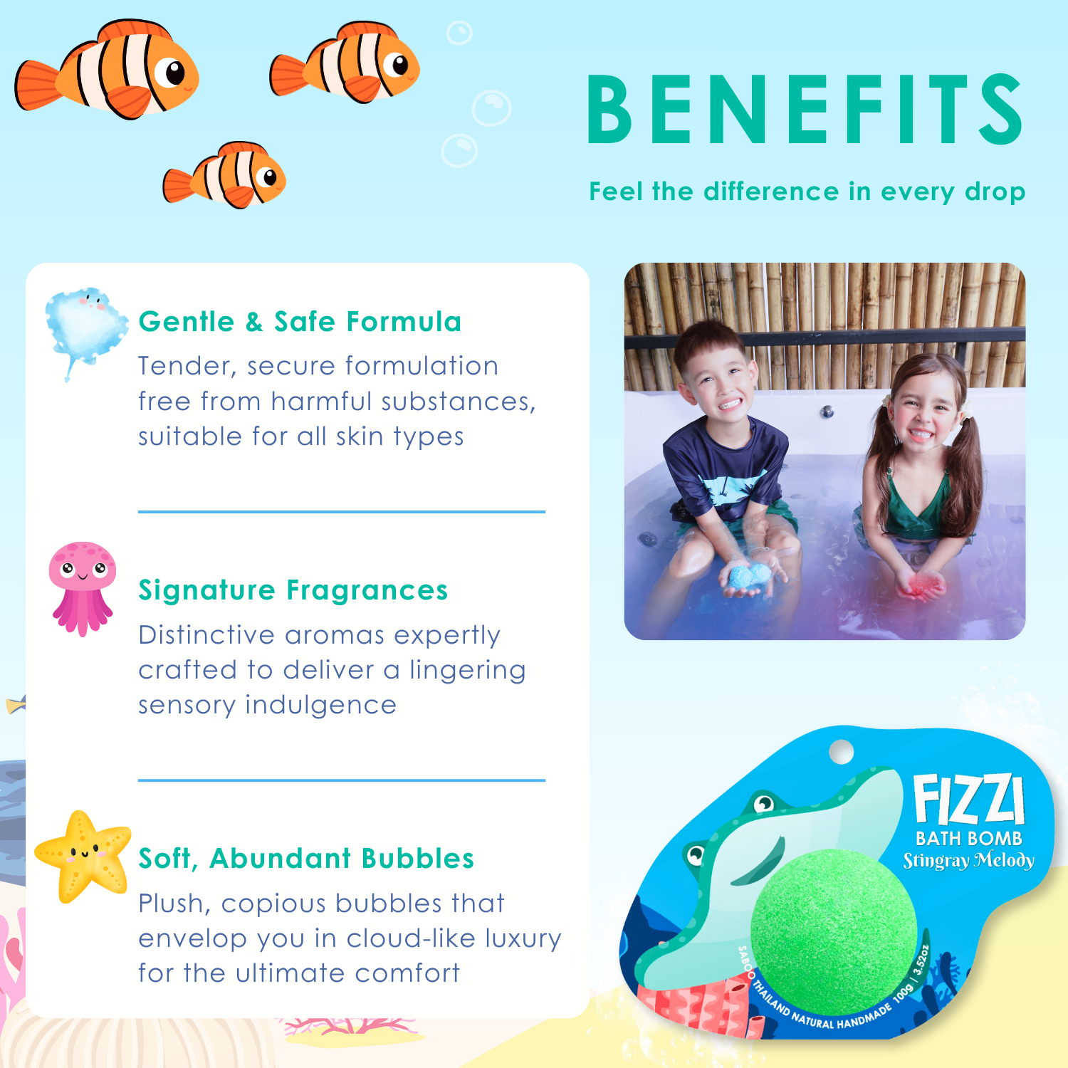 Our passion for natural bath products drives us to create elegant bath bombs using the finest ingredients, bringing you the graceful spirit of ocean creatures and vibrant lagoon adventures in every stingray melody experience.