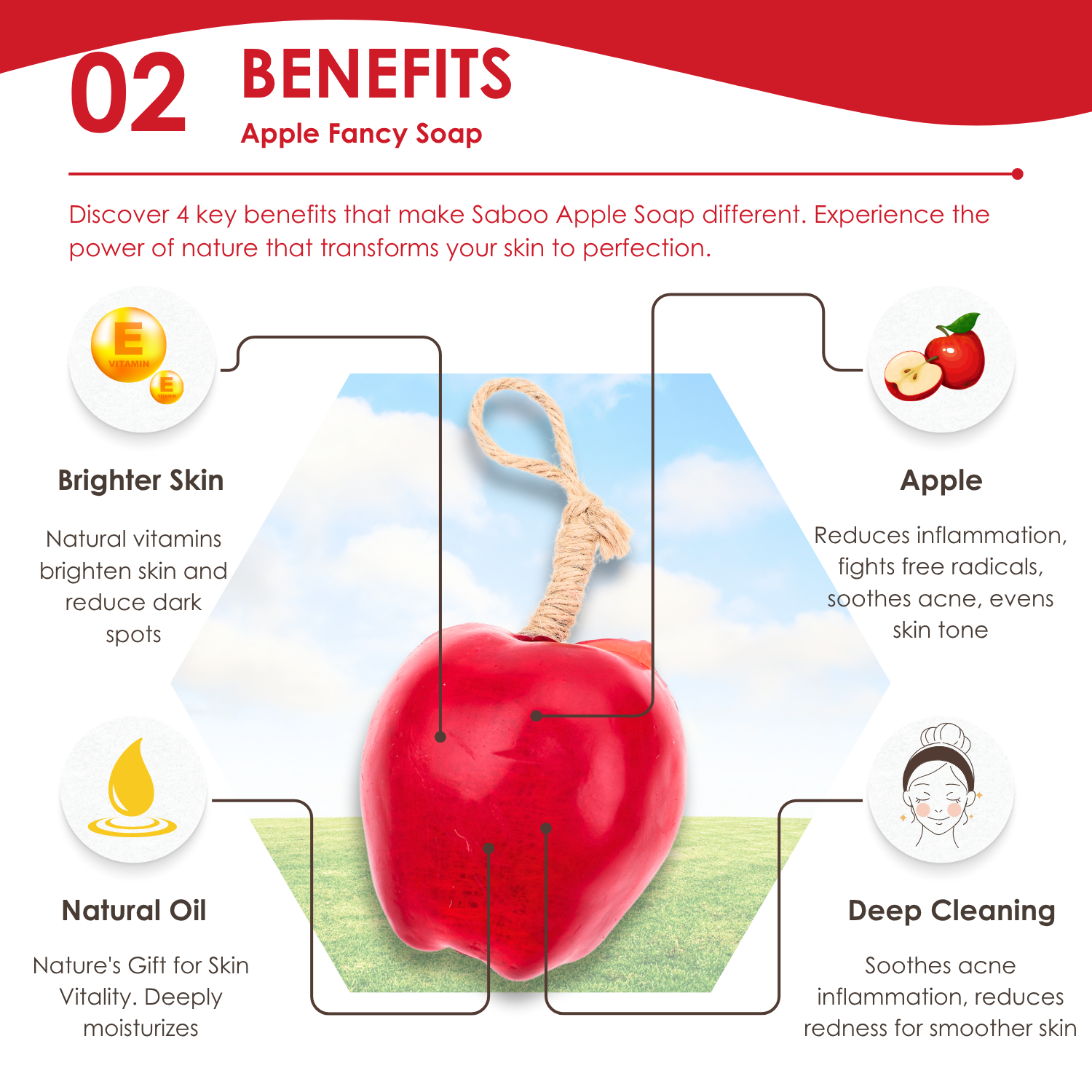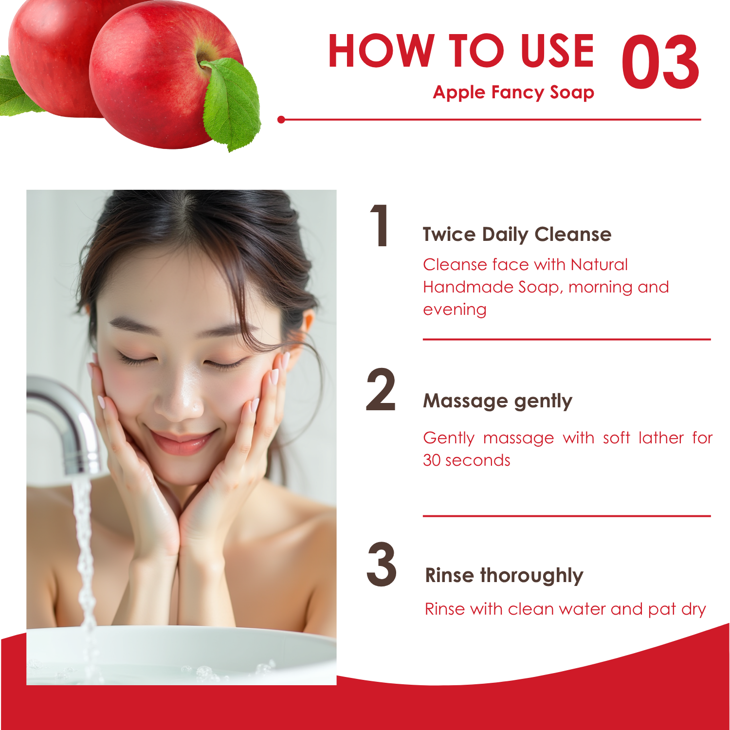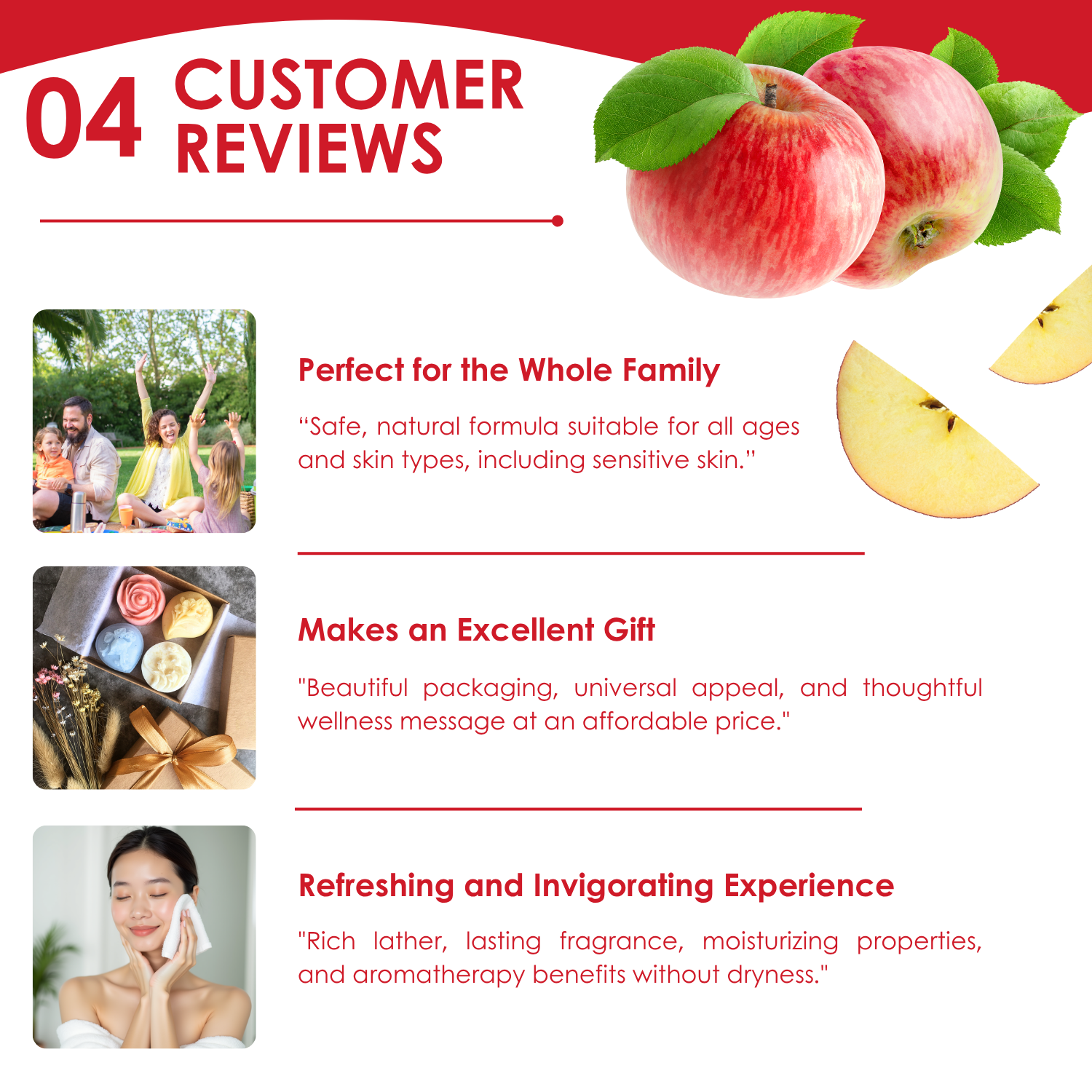 Invigorating apple red scent that brings the essence of fresh orchard apples to your bathing routine, leaving an energizing, uplifting fragrance that celebrates natural vitality.