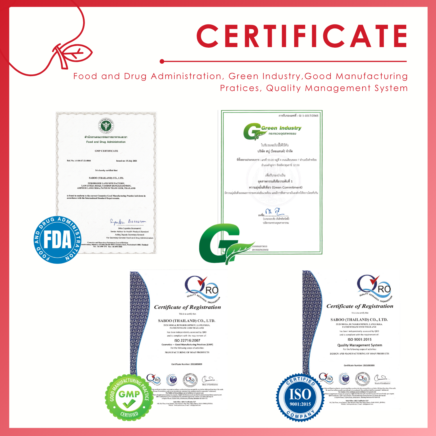 Factory Address: 55/20 Bigger Land Mini Factory, Lam Luk Ka Rd., Tambon Bung Kham Proy, Amphur Lam Luk Ka, Pathum Thani 12150