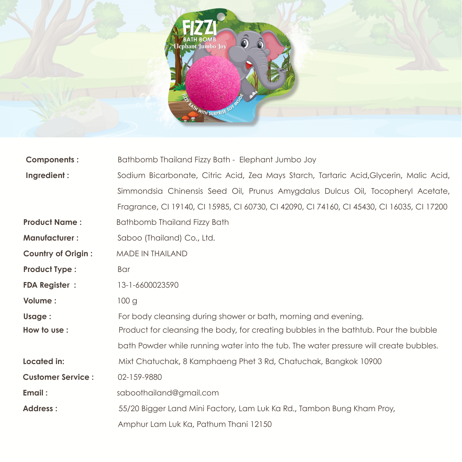 fizzy bath bomb, elephant bath bomb, jungle bath bomb, pink bath bomb, white bath bomb, kids bath bomb, jumbo bath bomb, joyful bath bomb, aromatherapy bath bomb, natural bath bomb, Thailand bath bomb, spa bath bomb, Saboo Thailand, Health & Beauty > Bath & Body > Bath Bombs