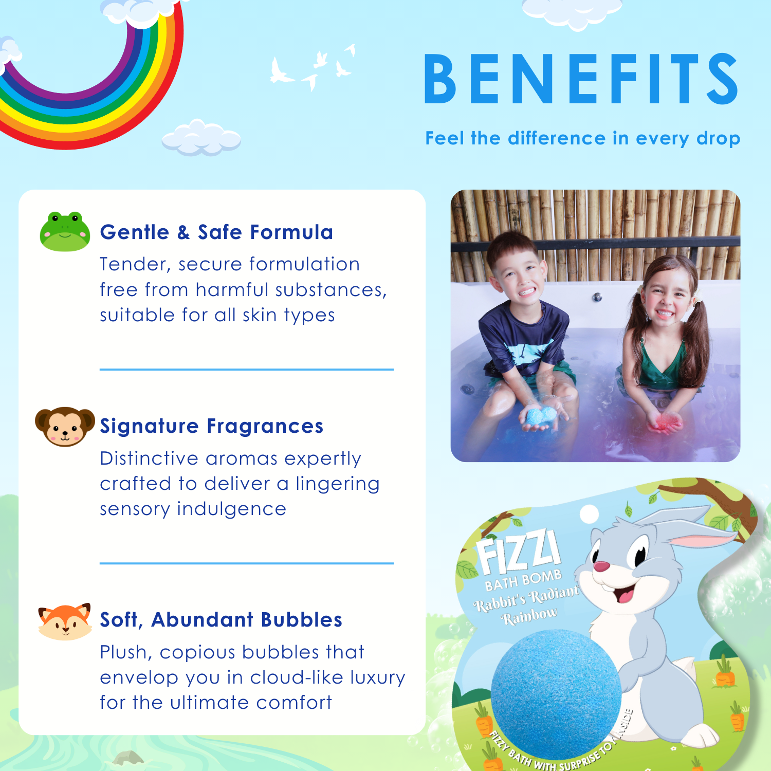 Magical effervescent formula that creates rainbow bubbles and releases gentle blueberry lavender fragrance